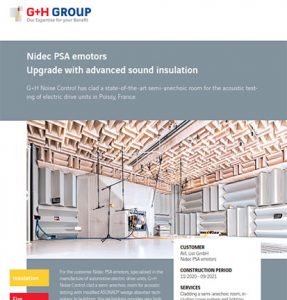 For the customer Nidec PSA emotors, specialised in the manufacture of automotive electric drive units, G+H Noise Control clad a semi-anechoic room for acoustic testing with modified ASONAD® wedge absorber tech-nology. In buildings, this technology provides very high sound reduction and keeps the noise/hindrance level to a very low range. The customer requirement was for an acoustic free field with a minimum radius of 2.2 m inside the room in the frequency range from 200 Hz to