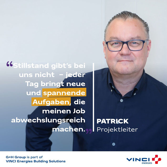 Auch nach so vielen Jahren gibt es für Patrick immer Neues zu lernen: „Stillstand gibt’s bei uns nicht – neue Projekte, neue Technologien, neue Herausforderungen. Jede Baustelle ist anders und genau das macht meinen Job spannend.“ G+H fördert Weiterentwicklung auf allen Ebenen – vom Azubi bis zur Führungskraft.