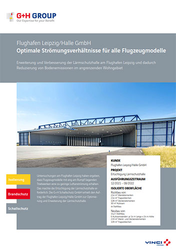 Untersuchungen am Flughafen Leipzig haben ergeben, dass Flugzeugmodelle mit eng am Rumpf liegenden Triebwerken eine zu geringe Luftanströmung erhalten. Das machte die Ertüchtigung der Lärmschutzhalle erforderlich. Die G+H Schallschutz GmbH erhielt den Auftrag der Flughafen Leipzig/Halle GmbH zur Optimierung und Erweiterung der Lärmschutzhalle.